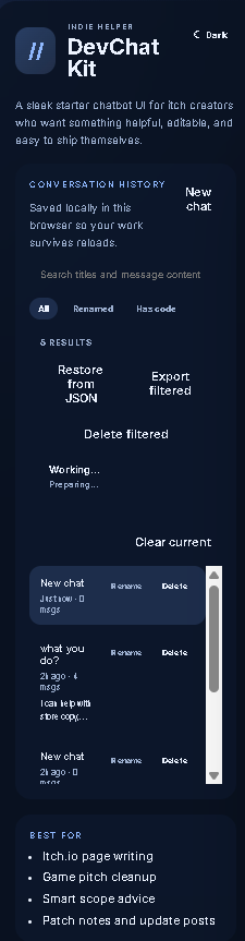 Build your own branded AI assistant faster with a polished, local-first workspace designed for indie dev tools, creator products, and itch.io-friendly commercial templates.